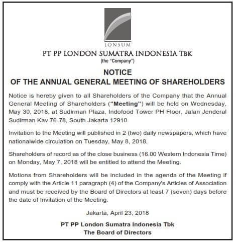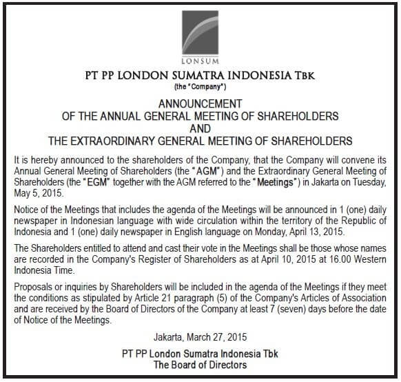 Resolution Summary Of The AGMS and EGMS of PT PP London Sumatra Indonesia Tbk |