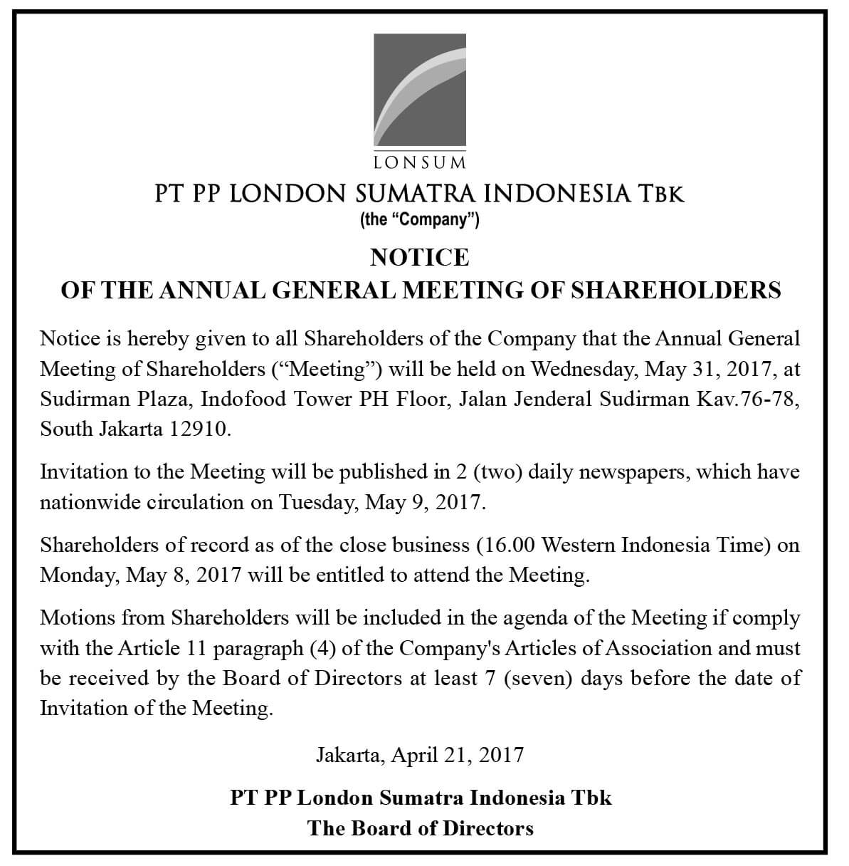 Resolution Summary Of The AGMS of PT PP London Sumatra Indonesia Tbk |